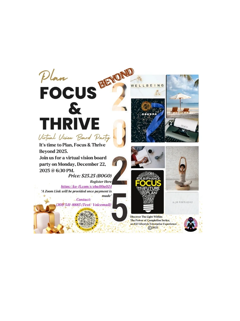 Are you ready for 2026? It’s time to Plan, Focus, and Thrive Beyond 2025. Join us for the "BEYOND 2025 Plan, Focus & Thrive" virtual vision board party on Monday, December 22, 2025, at 6:30 PM. Please Click tthe Link or Scan the QR Code to RSVP as soon as possible, as space is limited. 💻 Zoom link provided after registration P.S. Don't forget that it's Buy One, Get One (BOGO)—bring a friend